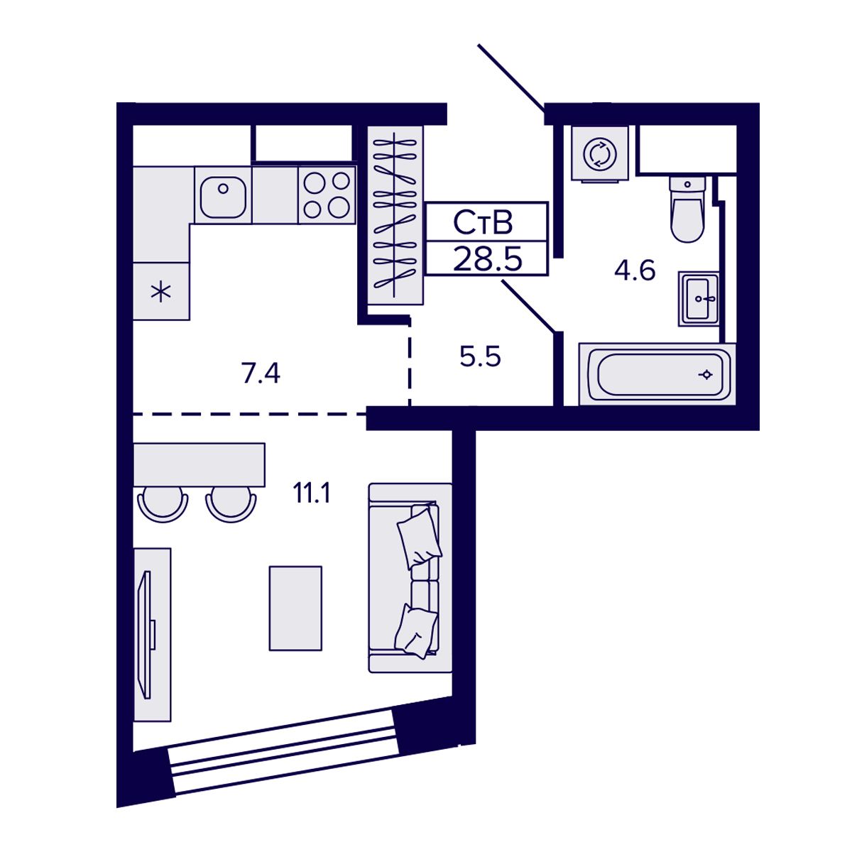 Общая площадь: 28.49 м²