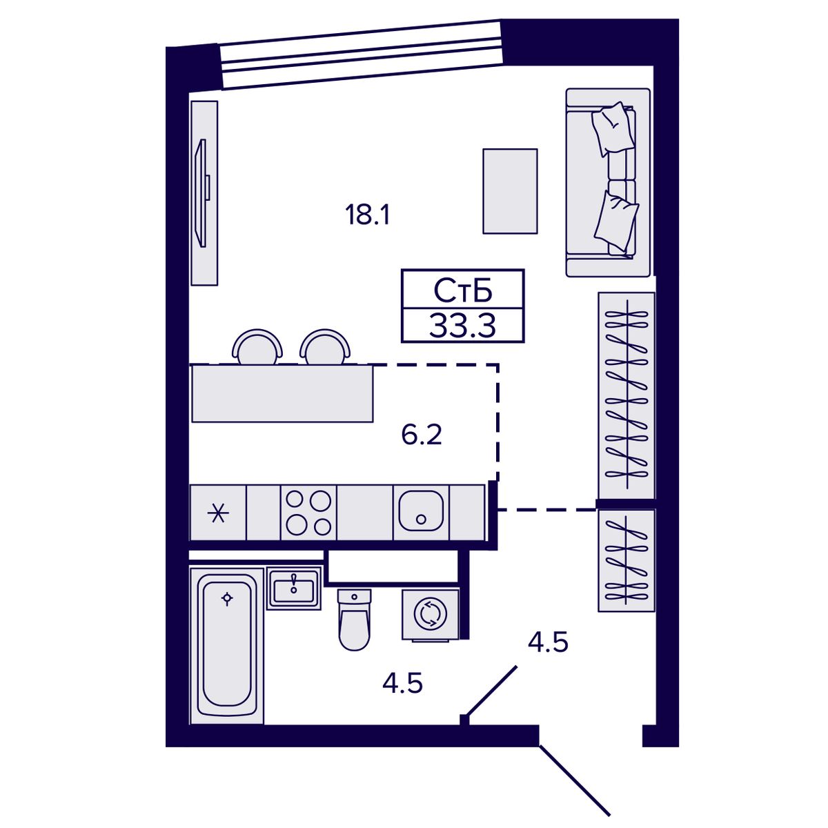 Квартира-студия 33.28 м² № 154